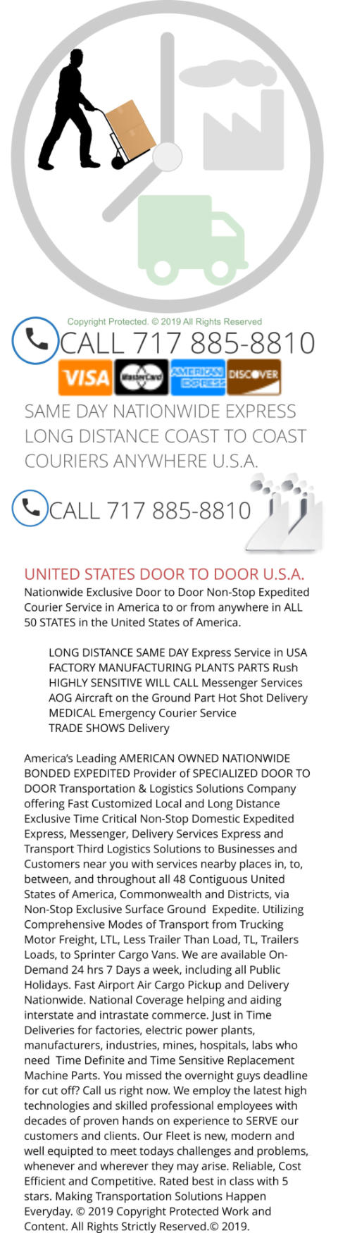 deadline and schedule. You need a On-Demand now SAMEDAY COURIER & DELIVERY SERVICE within The United States of America that has fast service accompanied by a quick, rapid and fast rate quote price. You want us to go where you shipment is going. Yes, we can help. Be absolutely sure that your package will get there in the time that you specify. We offer exclusive door to door SAMEDAY Courier & Delivery service throughout the entire US including but not limited to in the Northeast, Mid West, New England, Mid Atlantic, Southwest, Souheast, South, Northwest, Central States etc, We welcome and value new business and repeat customers. Give us the privilege to serve all your same day delivery needs. Our services are rated the amongst best in industry whether commercial or private residential. have a rush export shipment to charter or commercial airplane at an airport of your choice? Yes we can help with that. You have a domestic import that just cleared us customs at a seaport ( east or west coast ) or a domestic door to door international airport airfield that needs to be expedited to factory, manufacturing or power plant now. yes, we can help with critical customized delivery to a point of your choosing, we can even pick up the paper work for you. Late payroll? We can help with that using our secure hand carry delivery. Forgot you phone or laptop computer, tablet, pad, or medication? Yes, We can securely pick it up and deliver to wherever you are. You have a critical time definite trip and need your passport and visa delivered to you. Yes, we can do that. You missed the over night shipping deadline because you are running late and their offices are closed for the late night, weekend and holidays? Yes We can help we are the oops guys that can save your delivery. High value aircraft, aerospace or high technology parts for shift down manufacturing that needs to be delivered across country coast to coast or in between or across town or in town. You need just in time delivery? Yes we can do that. Need labels, sleeves labels printing supplies delivered for production? Yes can help. You need a secure motor carried for your high value life science products expedited delivery? Yes, we can help. Need your medical emergency surgery operartion live critical devices instruments components pharmaceutical pharma ingredients and finished products deliery on an emergency basis? Yes we can help. Worried about your bids, documents, confidential usb flash drive, rfi, grants and proposals making your deadline. Yes we can help. Call us for a fast no obligation or pressure We welcome new business and customers and welcome back returning recurring ones. Need your missing ingredient or mis-routed shipment today. Yes, we can help you. Temperature controlled for special paint coating expedited non-stop same day delivery. Forgot your ticket? We can help. Need a hand carry air courier for electric power and auto manufacturing plants critical parts? Yes we can help, we are a verified local business with national reach and network offices on the left and right coasts and in anywhere and everywhere in between at anytime open today open 24 hours. We offer services you need and want, not like other guys who give you what you deserve. We strongly and firmly believe that we have decades of professional comprehensive combined skills and experience that qualifies to complete your tasks. You want a long distance company and local business that rated one of the best in the field that is highly recommended and trusted. Look no further you found us. You want positive results. We can help with proven efficient dependable anytime transportation solutions. During your search you will find transport information including official webpages images offices locations address terminals fast contact information phone numbers local courier delivery business documents view maps and driving directions places video air courier messenger hand carry delivery logistics shipping mailing moving air freight cargo motor trucking domestic cargo airlines next flight out temperature control auto power plant parts delivery Bonded Same Day Courier Service, Dependable Transportation Service, Secure Shipping Company, High Value Expedited Shipping Service, Highly Sensitive Same Day Delivery Services, Nationwide Shipping and Mailing Service, Coast to Coast Trucking Company, Cross Country Freight Forwarding Service, Premium Comprehensive Logistics, private banking delivery service, executive delivery service, express delivery, legal court filing hand delivery services, Rush Messenger Services, On-Demand Logistics Service, high confidential usb flash drive deliver service, original or certified notorized documents delivery service, Exclusive Moving Company, Corporate Moving and Storage Company, Parcel Service, Commercial Postal Service, Construction Job Site Delivery